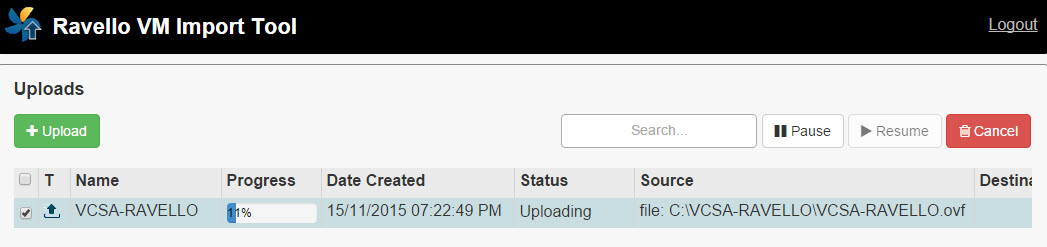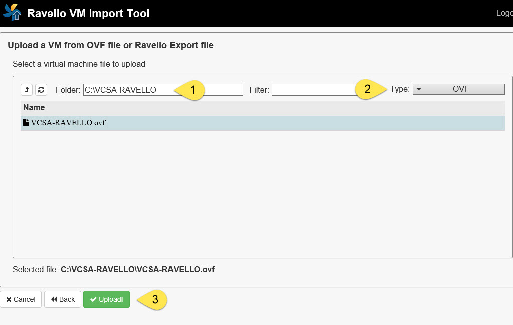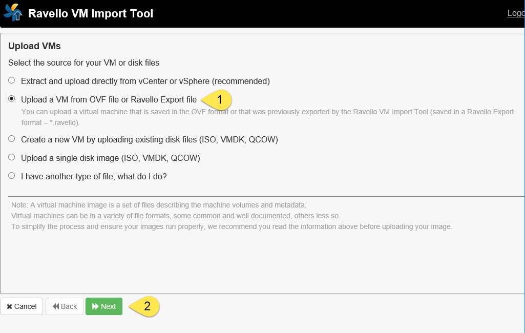 - Login the Ravello VM Import Tool and select Upload a VM from OVF file or Ravello Export file. Click Next.