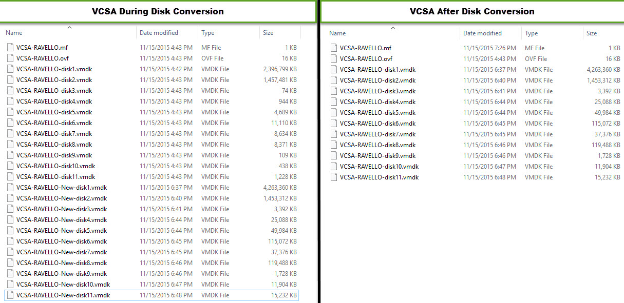 - Now there should be 22 VMDK disks, 11 original & 11 new. I recommend backing up the 11 original in case you need them at a later date. I created a backup directory and moved them there. Now rename the new VMDK disks to the original names.
