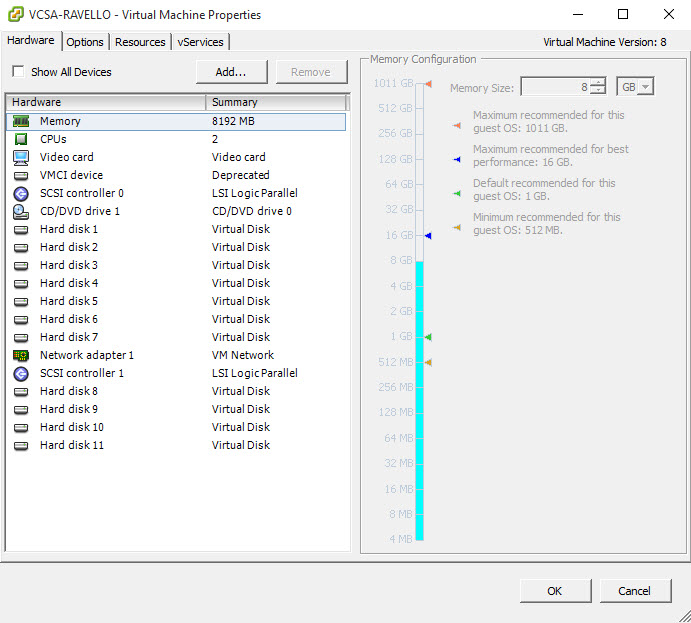 Here’s a logical view of the VCSA hard disks under their respected SCSI controller from the vSphere C# client.