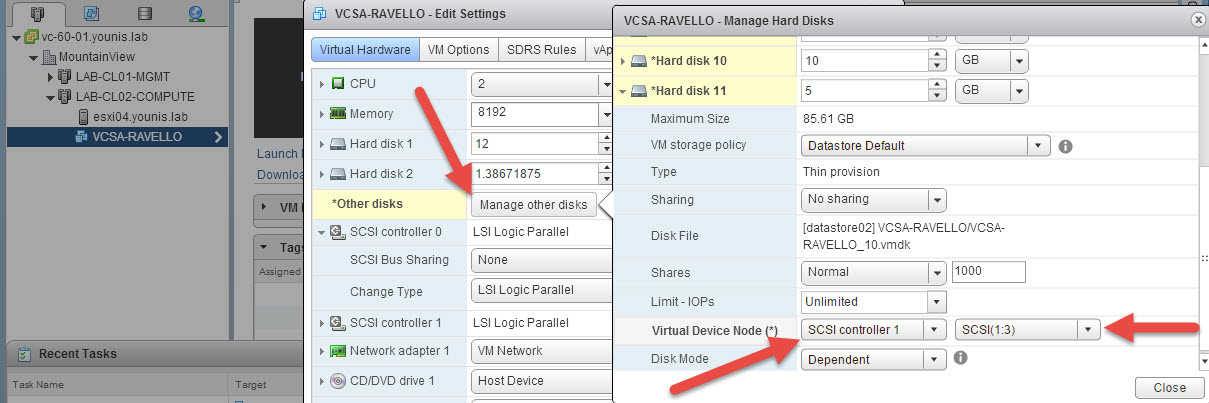 - Go to the Disk tab and verify that the VCSA hard disks are in order. If not place them in the correct number order using the arrows.