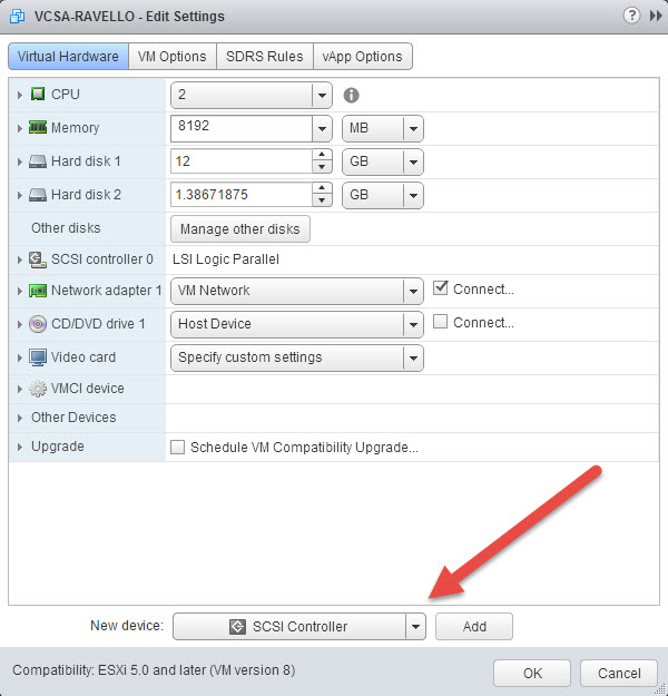 Note: Ravello will automatically add a second HBA on their end to support the newly added SCSI controller. - Power on the VCSA, make sure that it’s still functional and you have access to the web client. Once that’s been verified power off the VCSA.