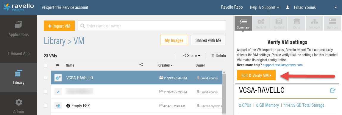 - Prior to adding the VCSA to the newly created application we need to verify its configuration. Go to Library –> VM and select the VCSA that was just uploaded. One the right hand side click Edit & Verify VM.