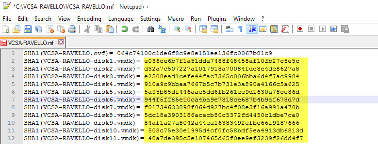 - Open the manifest file (.mf) with your favorite editor and replace each VMDK hash with the newly generated one.