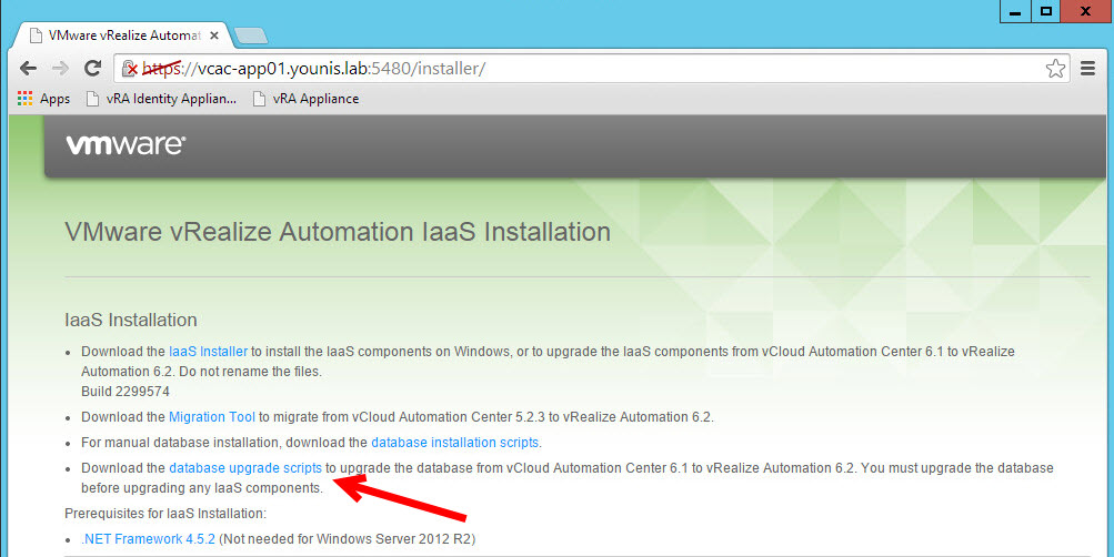 Note: VMware’s documentation states to run this command only once, make sure a DB backup is taken prior to upgrade. - Download the IaaS installer from the vRA Appliance (step 1) and don’t change the file name.