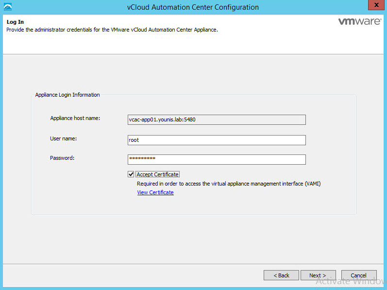 - Enter the vRA Appliance root account and password, check Accept Certificate and click Next.