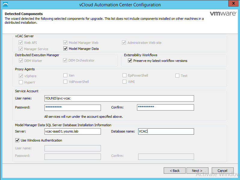 - Select the components to upgrade (my setup has all components on the same server). Verify service account information and add database information. Click Next.