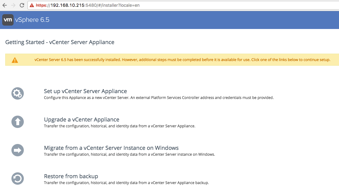 Previously the VCSA installer only had one stage. This meant any issues that occurred during the deployment would require a complete re-deploy. Of course, this was a pain when starting a deployment and walking away only to come back and find it had failed. Those days are now in the past, the VCSA 6.5 installer is now a two stage deployment process. Stage 1 deploys the OVA, configures basic networking, and starts the VAMI service. Stage 2 is the setup / configuration of the VCSA. After Stage 1 is complete you are presented with two options, to either close the installer or continue on to Stage 2. This ability to close the installer between stages provides a few possibilities. The first is the opportunity to take a snapshot between stages, in case any mistakes occur during Stage 2. Just for the record, taking snapshots between stages while handy is not supported. Second, if you have pressing business to take care of, you can always come back and finish the VCSA configuration later through the VAMI. The VAMI provides the option to continue the setup of the VCSA, starting at Stage2.