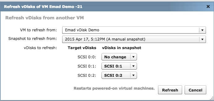 - Select the VM, Snapshot, and vDisk to refresh from dropdown(s). Click Refresh.