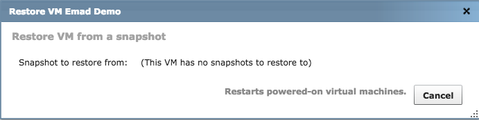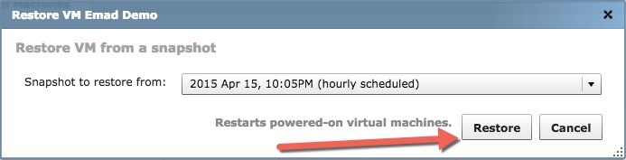 - Select a VM, right click and choose Restore VM. You can leverage an existing VM snapshot or create a new one.