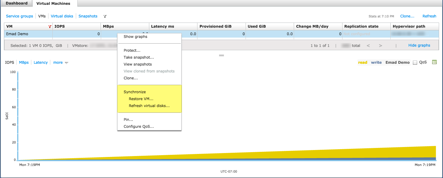 SyncVM has two capabilities: Restore VM and Refresh virtual disks. The Restore VM allows the refresh of data from any point in time on any individual VM. This point in time can be from an hour ago, days, or weeks. The flexibility SyncVM provides is the ability to move between any point in time, forwards or backwards.
