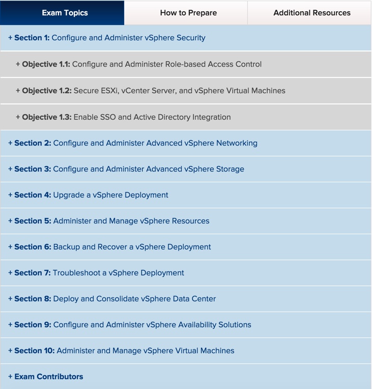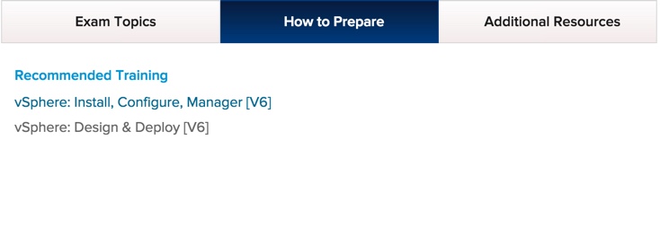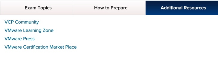 The Exam Topics are broken into 10 sections. Each with collapsable objectives with links to the corresponding documentation. This resembles the blueprint, but is not downloadable. The how to prepare is just recommended training classes. Of the two recommended courses listed, the ICM6 is the only one currently available. Additional Resources are links to the VCP forum, VMware Press, etc. How does one find this information?