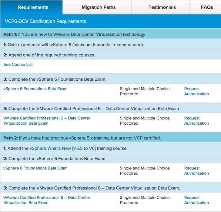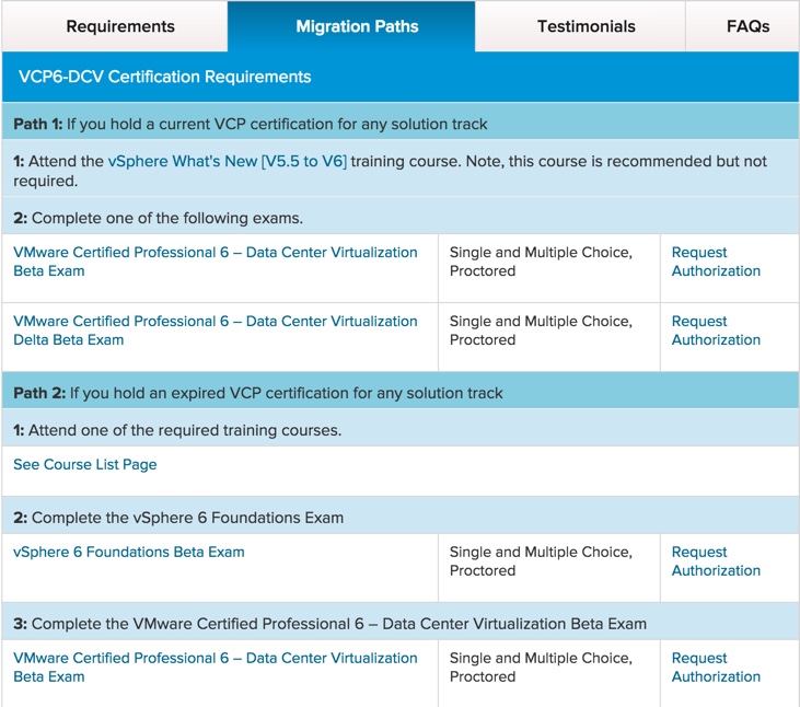 If you are new to virtualization or have never taken a VCP exam then the Requirements tab is for you. There is an explanation of which exams to take and request for the beta authorization. The VCP6-DCV now requires two exams: VCP6-Foundation & VCP6-DCV. The exception to this rule is if you are currently a VCP. Current VCPs can choose to take one exam. Which includes the VCP6-DCV Delta or the VCP6-DCV. It looks like the difference between exams is number of questions. The Delta is only 75 questions compared to 100 questions for the other exams. If your VCP has expired then its two exams for you. This information is under the Migration Paths tab. There is also a Testimonials tab and FAQ tab but with limited information as of today.
